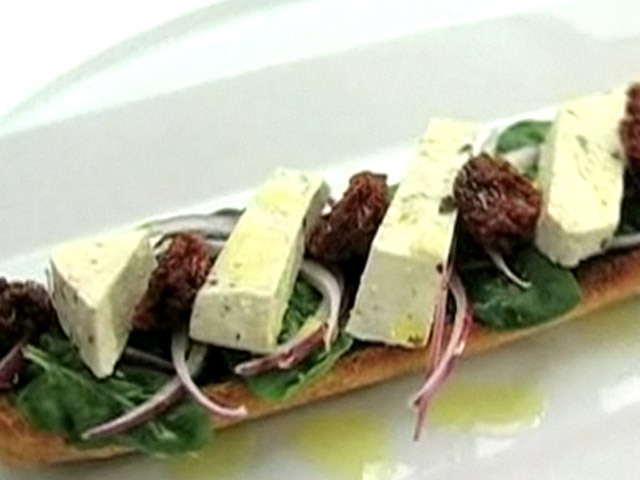 Рецепт сэндвича из шпината и тофу.Состав:шпинат, тофу, багет, оливковое масло, красный лук, чеснок, сушеные помидоры, оливки.
