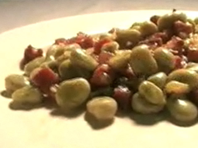 Рецепт бобов с ветчиной.Состав:бобы, ветчина, белое вино, мука, соль, масло, лук.
