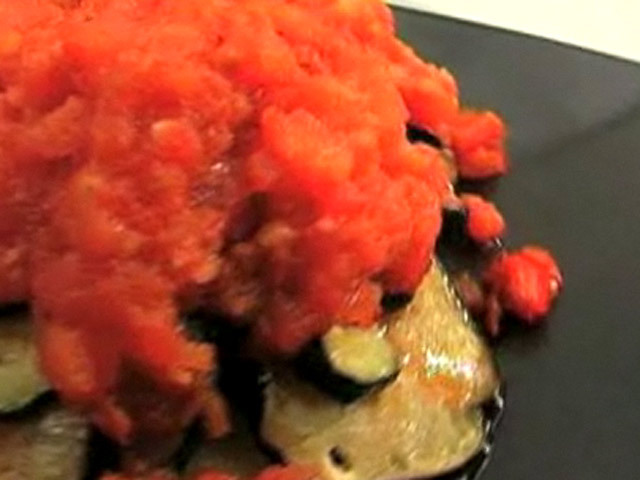 Рецепт испанской кухни. Картофель с овощным соусом.На 2 порции:помидоры — 4 штуки;картофель — 2 штуки;кабачок — 1 штука;баклажан — 1 штука;перец — 1 штука;чеснок — 1 зубчик;тросниковый сахар — 1 чайная ложка;соль, черный перец, оливковое масло. Язык: Русский