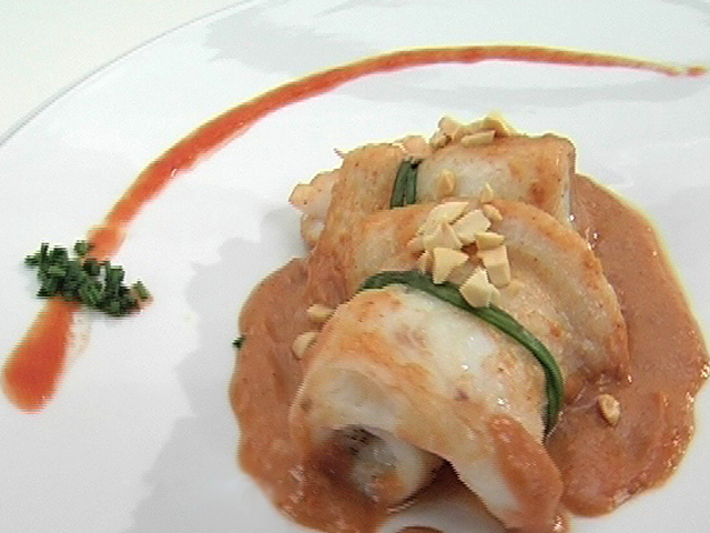 Нежное филе морского языка с бесподобным арахисовым соусом.Состав:томатная паста — 1/2 столовой ложки;арахис — 50 гр;кокосовое молоко — 50 гр;рыбный бульон — 100 гр;арахисовое масло — 1 чайная ложка;зеленый лук — 1 пучок;морской язык — 2 штуки;соль, перец — по вкусу. Язык: Русский