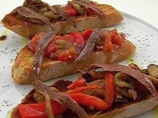 Горячая закуска с запеченными овощами.Состав:лук — 1 штука;баклажан — 1 штука;перец — 1 штука;анчоусы в масле — 6 штук;помидоры — 3 штуки;чеснок — 1 зубчик;чабатта — 3 кусочка;оливковое масло, вишневый уксус, соль, тмин — по вкусу. Язык: Русский