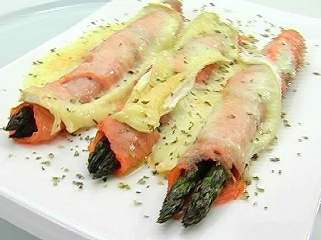 Вкусная горячая закуска из спаржи.Состав:спаржа — 3 ростка;лосось — 250 гр;вода — 1 литр;сыр Бри — 100 гр;немного льда;соль, орегано — по вкусу.