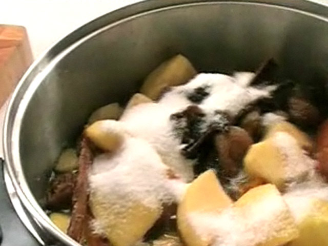Рецепт вкусного компота из свежих фруктов.Состав:яблоки — 3 штуки;груши — 3 штуки;сладкое вино — 200-250 гр;сахар — 150 гр;вода, инжир, чернослив, персики, корица.