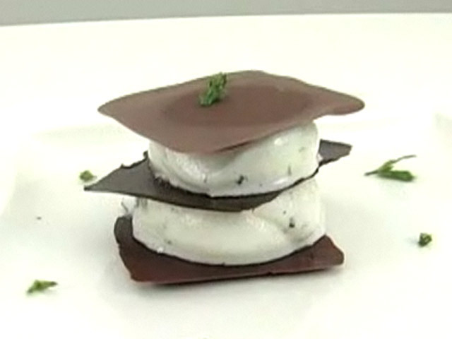 Рецепт самого вкусного десерта из шоколада.Состав:мята — 15 гр;вода — 270 гр;лимонный сок — 250 гр;сахар — 220 гр;яичные белки — 55 гр;шоколад.