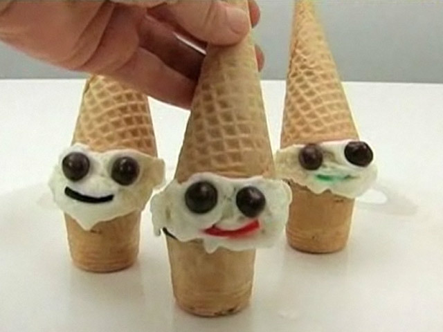 Забавный десерт из мороженого.Состав:вафельные стаканчики, вафельные рожки, мороженое, карамель,орехи в шоколаде, лакрица.
