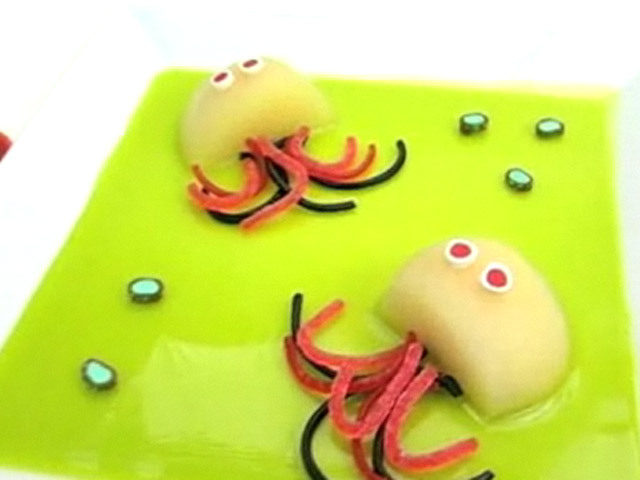 Сладкий фруктовый десерт из сочной груши в сиропе.Состав:груша — 1 штука;конфеты, вода, желатин, лакрица.