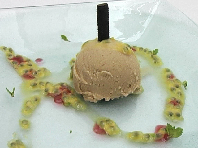 Описание материала:Необычный десерт для знатоков мороженого.Состав:лакрица — 3 палочки;молоко — 400 гр;желтки — 6 штук;вода — 100 гр;сахар — 150 гр;гренадилла — 2 штуки.