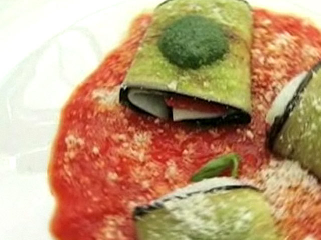 Рецепт рулетиков из баклажанов с соусом.Состав: баклажан — 1 штука;оливковое масло — 1 столовая ложка;сливочное масло — 10 гр;песто — 80 гр;томатный соус — 3 столовых ложки;пармезан — 2 столовых ложки;жареные перцы, моцарелла. Язык: Русский