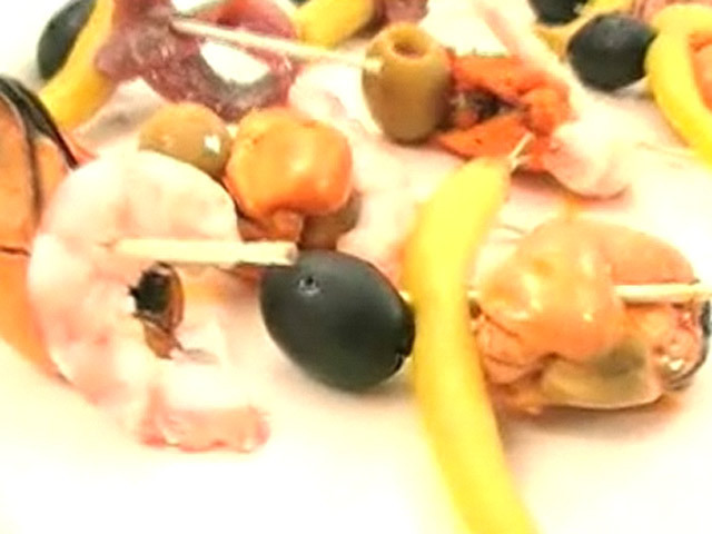 Рецепт вкусной закуски с анчоусами и креветками.Состав:анчоусы — 8 кусочков;желтый чили — 12 штук;мидии — 5 штук;креветки — 9 штук;оливки, заправка.
