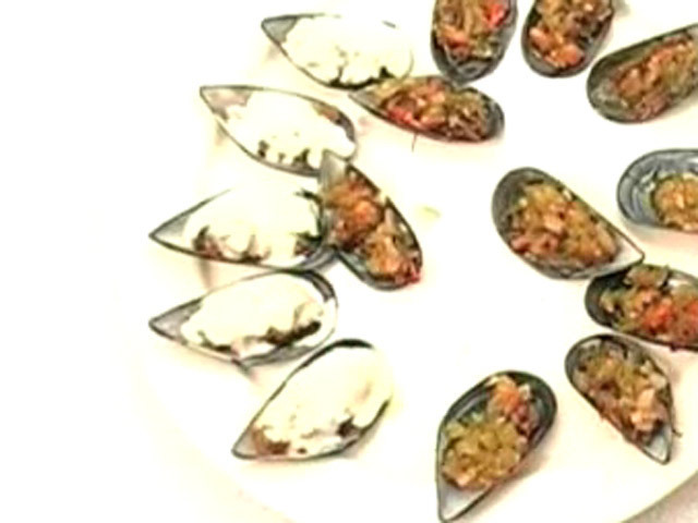 Рецепт приготовления мидий.Состав:мидии — 10 штук;лук — 1 штука;яйцо — 1 штука;перец — 1 штука;чеснок — 4 зубчика;соль, перец, масло, белый соус, коньяк, панировочные сухари, острая паприка. Язык: Русский
