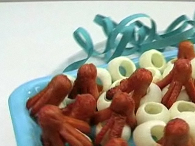 Забавные фигурки из любимых продуктов.Состав:сосиски — 20 штук;томатный соус, горчица, тростниковый сахар, мед.