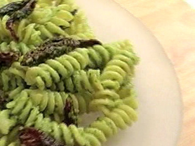 Закуска из макарон с зеленым соусом песто.Состав:сущеные помидоры — 50 гр;макароны — 1 чашка;пармезан — 50 гр;кедровые орешки — 30 гр;чеснок — 1 зубчик;базилик, оливковое масло, черный перец, морская соль. Язык: Русский