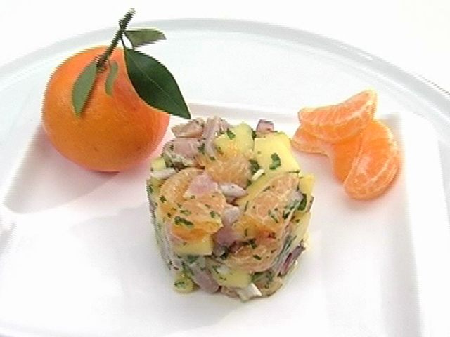 Свежий салат из тунца с апельсиновым соусом.Состав:мандарин — 1 штука;манго — 1 штука;лук — 1/2;сок половины лимона;тунец — 3 кусочка;кориандр, оливковое масло, соль — по вкусу. Язык: Русский