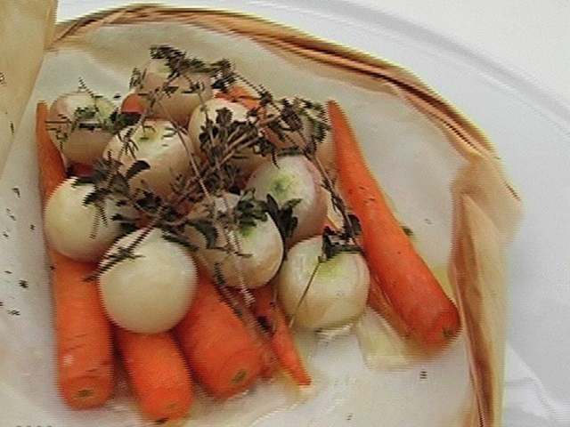 Вегетерианская горячая закуска из моркови с турнепсом.Состав:турнепс — 7 штук;морковь — 7 штук;немного тимьяна, орегано;оливковое и сливочное масло, соль, смесь перцев — по вкусу. Язык: Русский