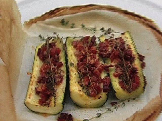 Осенний коктейль из овощей и ветчины.Состав:кабачок — 1 штука;свежий тимьян — 8 веточек;ветчина — 1 чашка;горчица — 1 столовая ложка;сыр — 1 столовая ложка;оль, перец — по вкусу. Язык: Русский