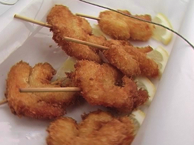 Пикник высшего света с креветками в сухарях.Состав:креветки — 12 штук;яйцо — 1 штука;сухари — 90 гр;мука — 50 гр;вода — 1 столовая ложка;лимон — 3 дольки;соль, оливковое масло — по вкусу. Язык: Русский