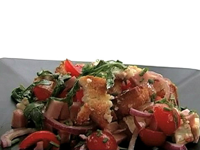 Простой салат из простых продуктов.Состав:лук — 1 штука;руккола — 1 пучок;помидоры-черри — 22 штуки;сыр из козьева молока — 100 гр;копченая ветчина — 2 кусочка;кленовый сироп, белый винный уксус, оливковое масло, морская соль, черный перец, бальзамический уксус, петрушка. Язык: Русский