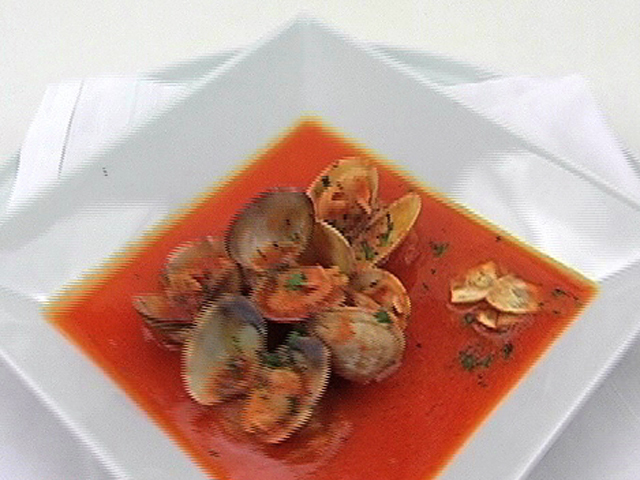 Вкусная и полезная похлебка из моллюсков.Состав:моллюски — 300 гр;томат — 150 гр;вода — 100 гр;сухое вино — 40 гр;чеснок — 1 зубчик;хлеб — 4 дольки;оливковое масло, соль, черный перец, паприка — по вкусу. Язык: Русский