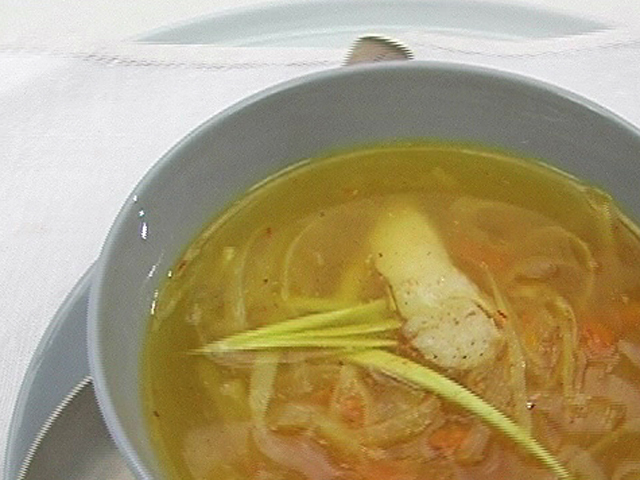Суп из нежного морского языка.Состав:морской язык — 2 штуки;рыбный бульон — 400 гр;фенхель — 50 гр;лук порей — 1/2 стручка;томат — 1/2 штуки;цедра одного апельсина;морковь — 1/2 штуки;лук — 1/2 штуки;шафран, соль, белый перец, лавровый лист — по вкусу. Язык: Русский