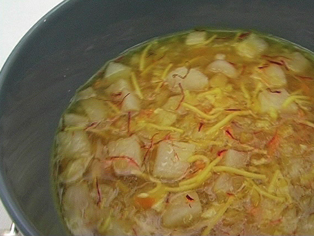 Каталонский суп.Состав:лук — 1 штука;сельдерей — 1/2 стебля;морковь — 1 штука;турнепс — 2 штуки;картофель — 1 штука;капуста — 100 гр;бекон — 50 гр;вермишель — 30 гр;рис — 30 гр;соль, перец, шафран — по вкусу. Язык: Русский