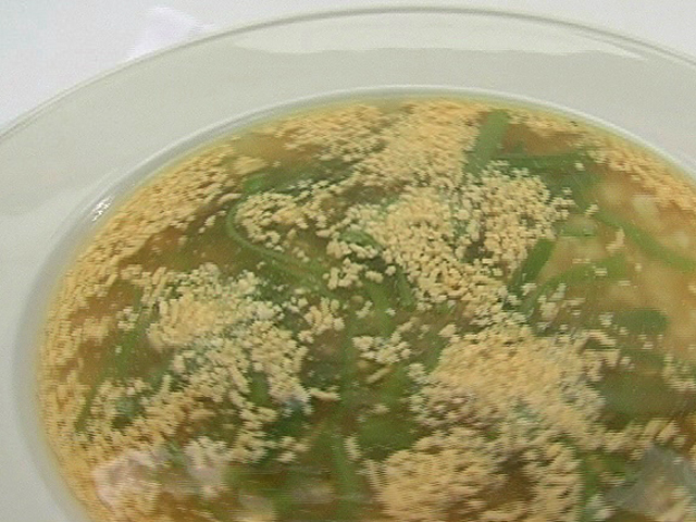Простой и вкусный суп «Мимоза».Состав:фасоль — 100 гр;куриный бульон — 400 гр;яйцо — 1 штука;соль, перец — по вкусу.
